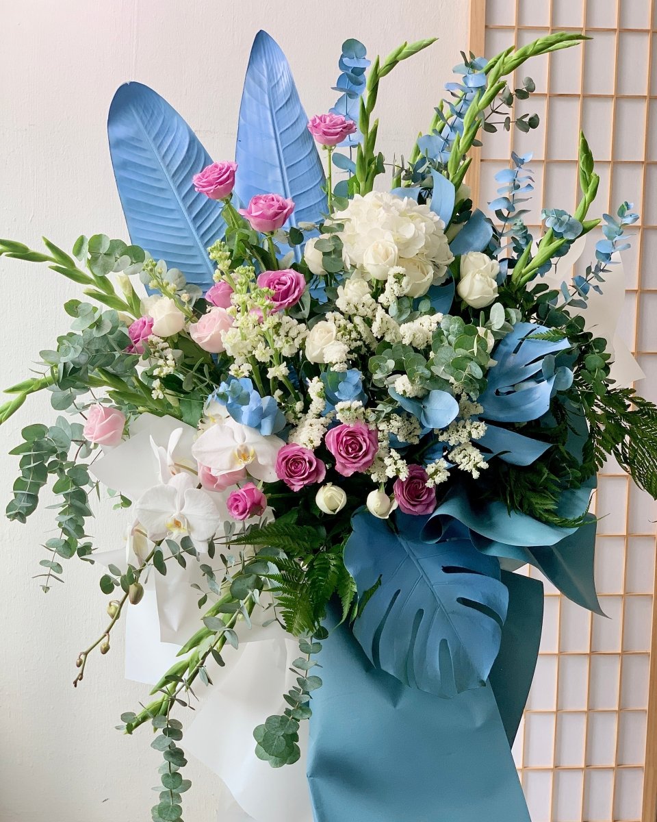 3. Blue Serenity Blooms Flower Stand - With its calming blue and white flowers, this flower stand from Ana Hana Flower conveys peace, serenity, and support, making it an excellent choice for expressing sympathy.