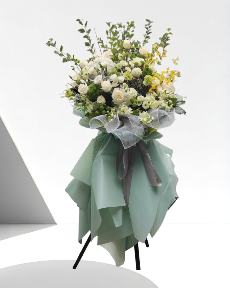 1. Ivory Blossom Harmony Flower Stand - This elegant flower stand from Ana Hana Flower features a harmonious blend of white and ivory flowers, signifying purity and peace. It's a thoughtful way to convey your sympathy and support.