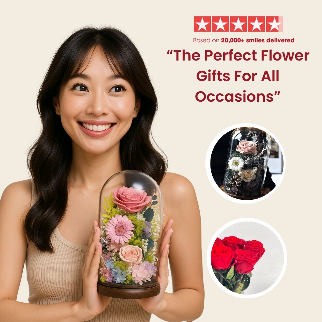 Our Flower Dome features a three large premium rose with stalk! Each dome is lovingly handcrafted piece by piece and no two are the same. Product summary Handcrafted preserved floral arrangement in a glass dome Arrangement sits on a wooden base Dome size (Diameter x Height):...- ¥26,500