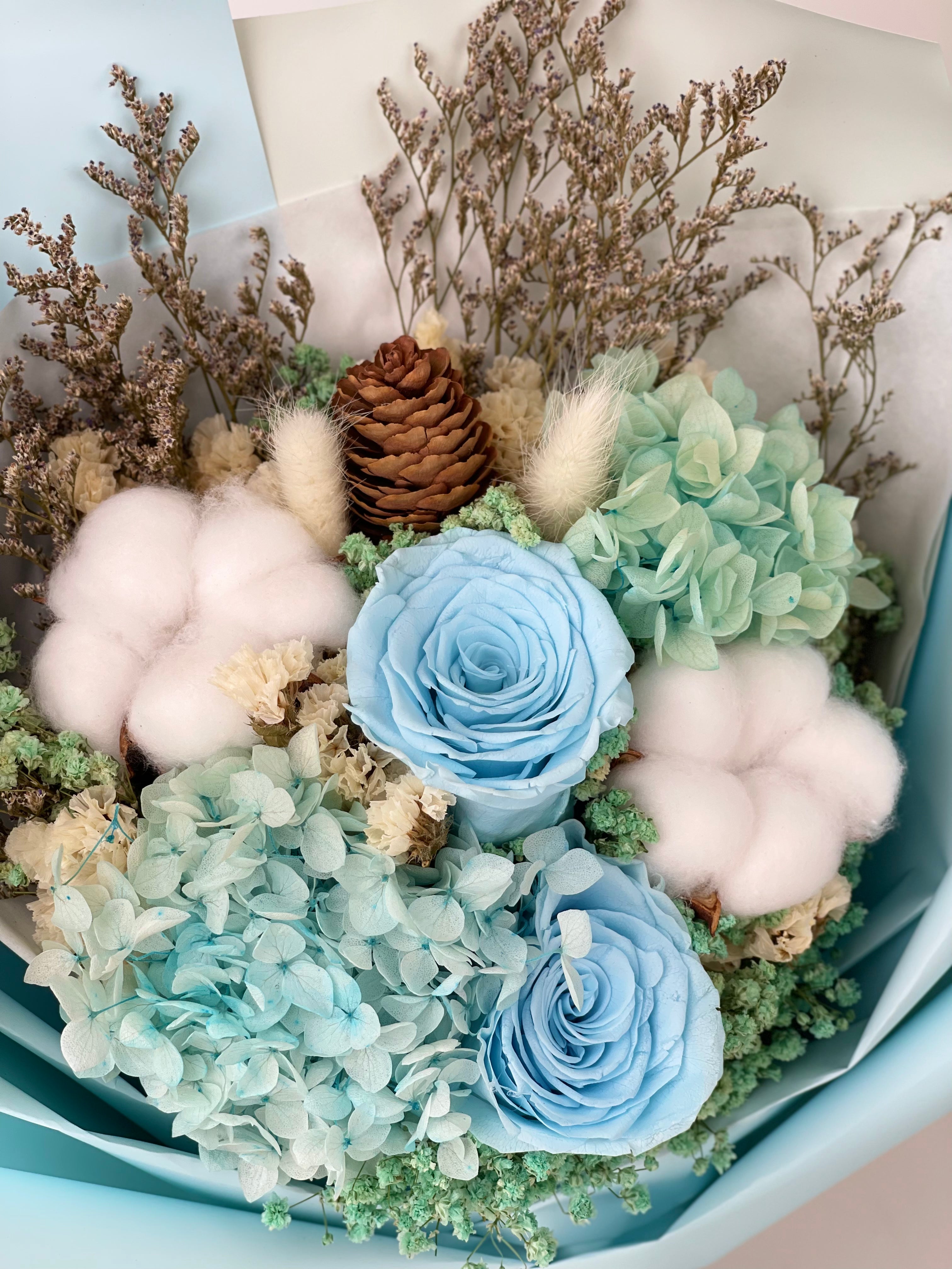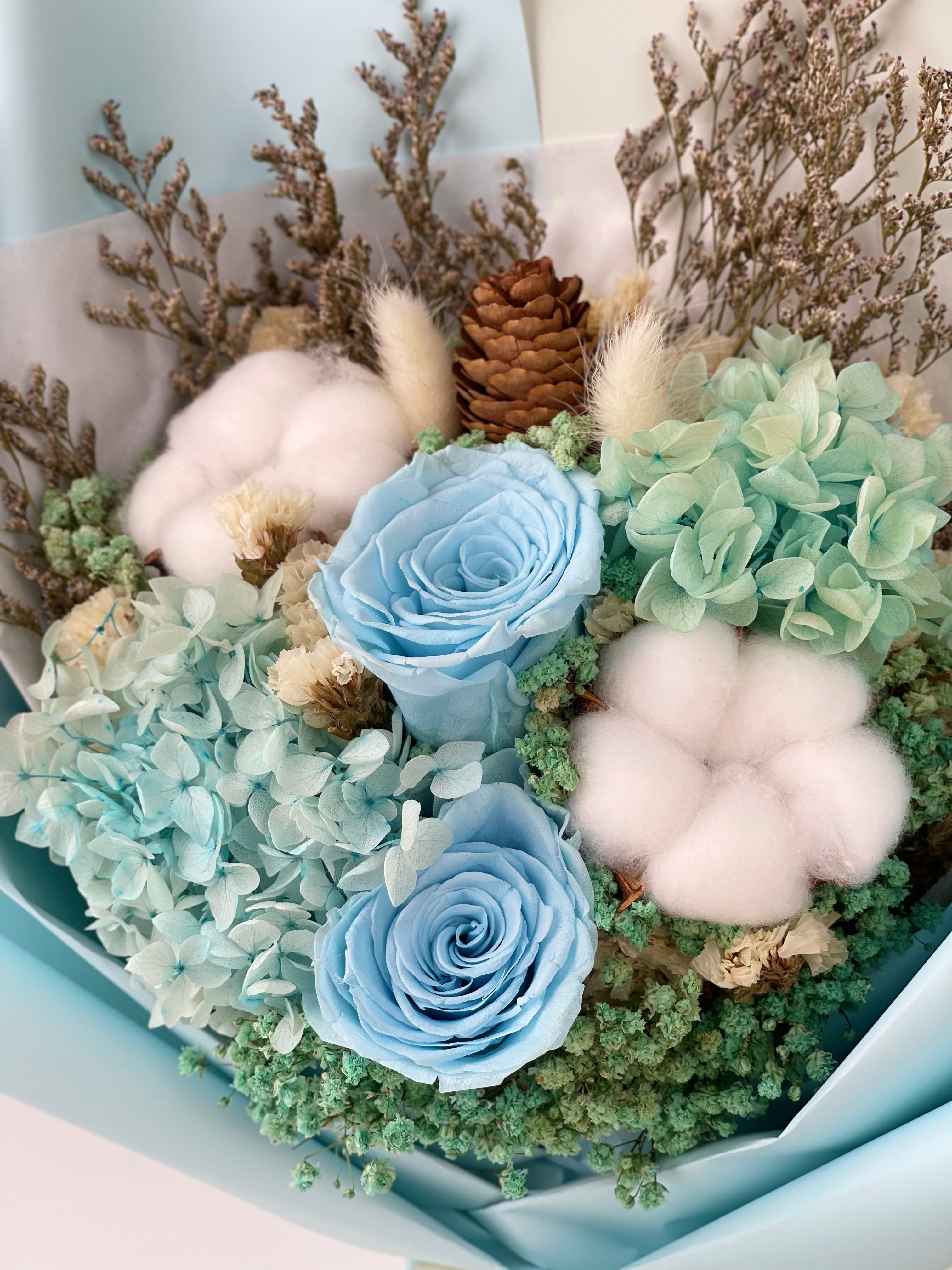 Bluro! is a preserved flower bouquet with a beautiful arrangement of roses, hydrangeas and cotton flower resembling the Mother Of Pearl. This arrangement also represents innocence, purity and femininity.