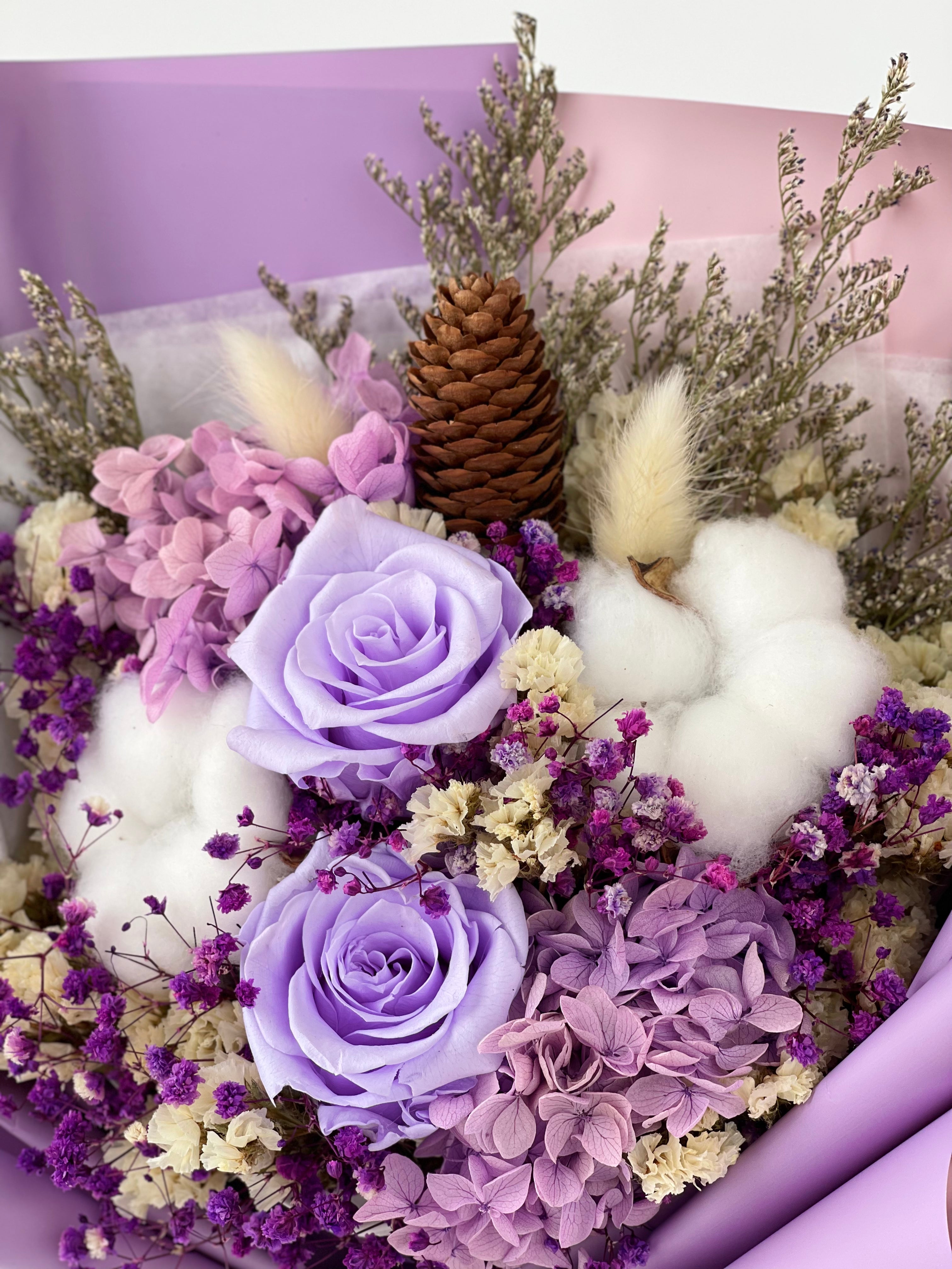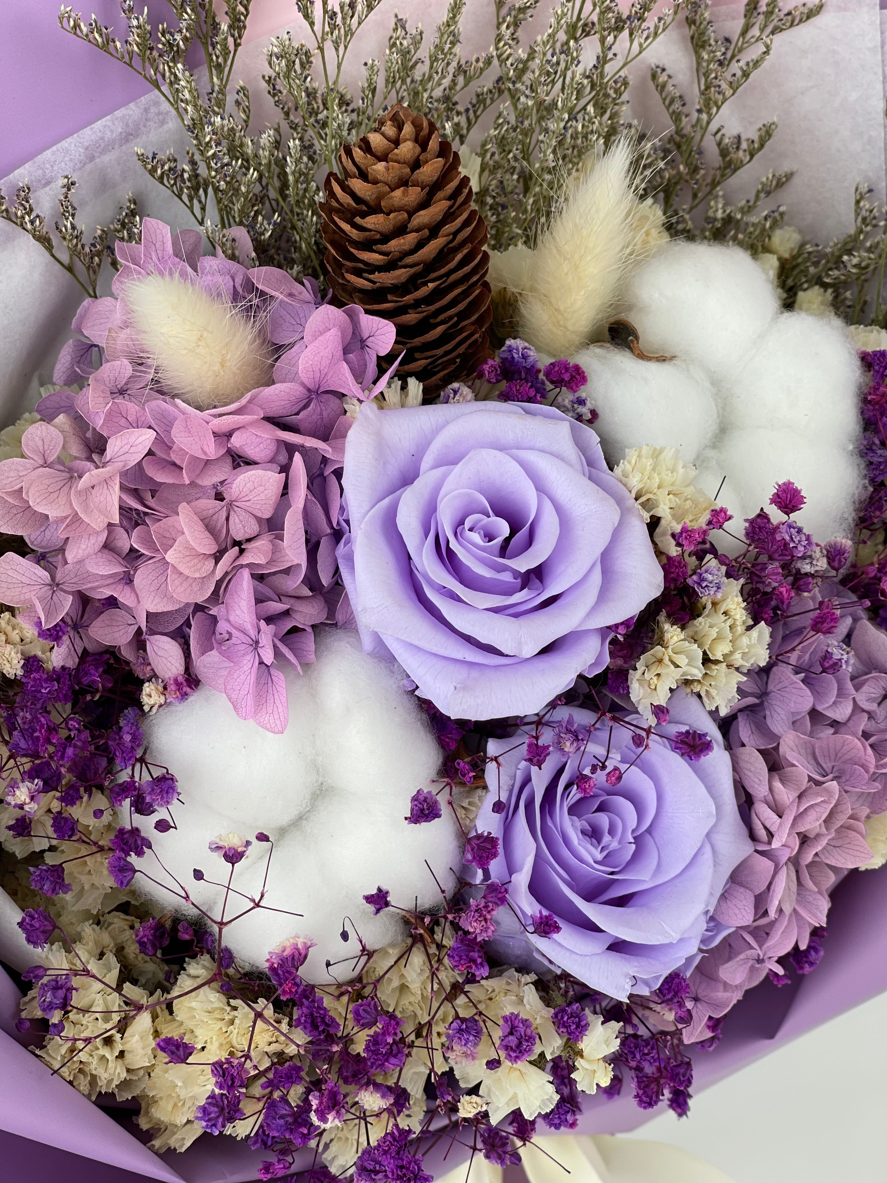 Purpo! is a preserved flower bouquet with a beautiful arrangement of roses, hydrangeas and cotton flower resembling the Mother Of Pearl. This arrangement also represents innocence, purity and femininity.