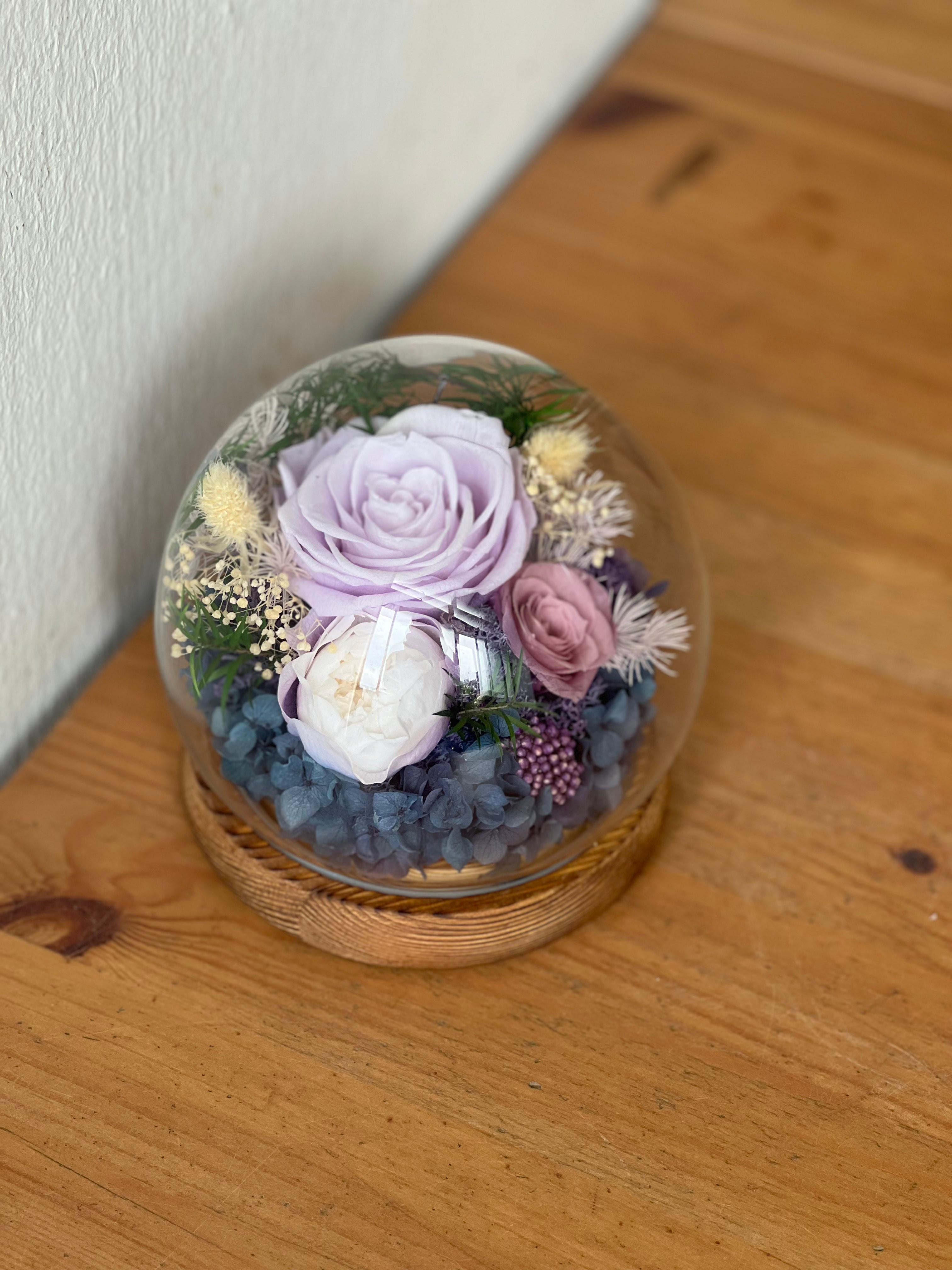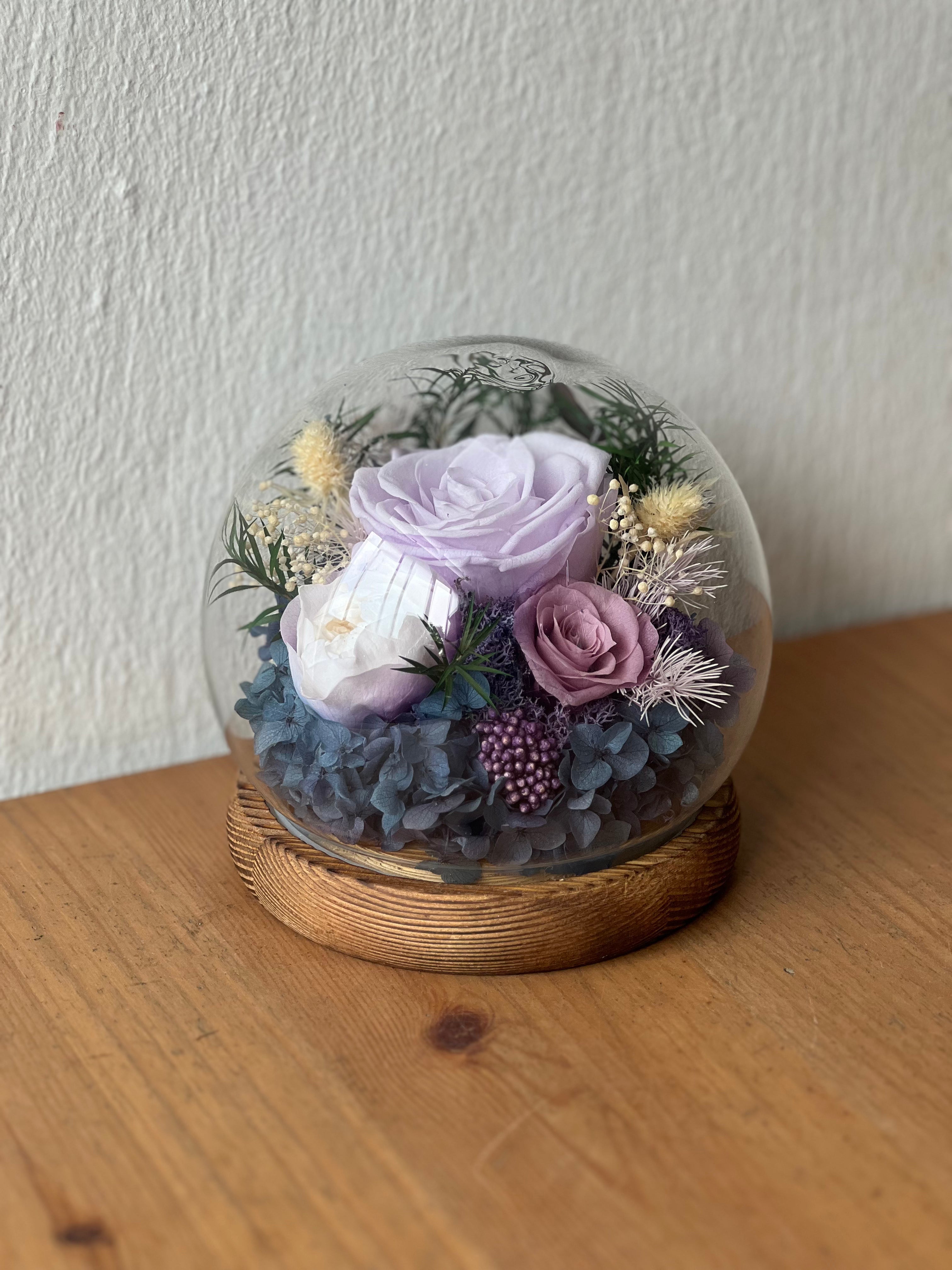 • Handcrafted preserved floral arrangement in a glass ball dome